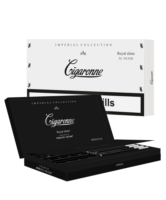 Perlite in the filter layer reduces the levels of tar and nicotine and absorbs combustion by products up to 90%. - Hygienic hot foil line on the filter’s tipping paper The specific length of Cigaronne's Hollow Filter protects the eyes from tobacco smoke and prevents nicotine stains on fingers, which is an essential part of hygiene.